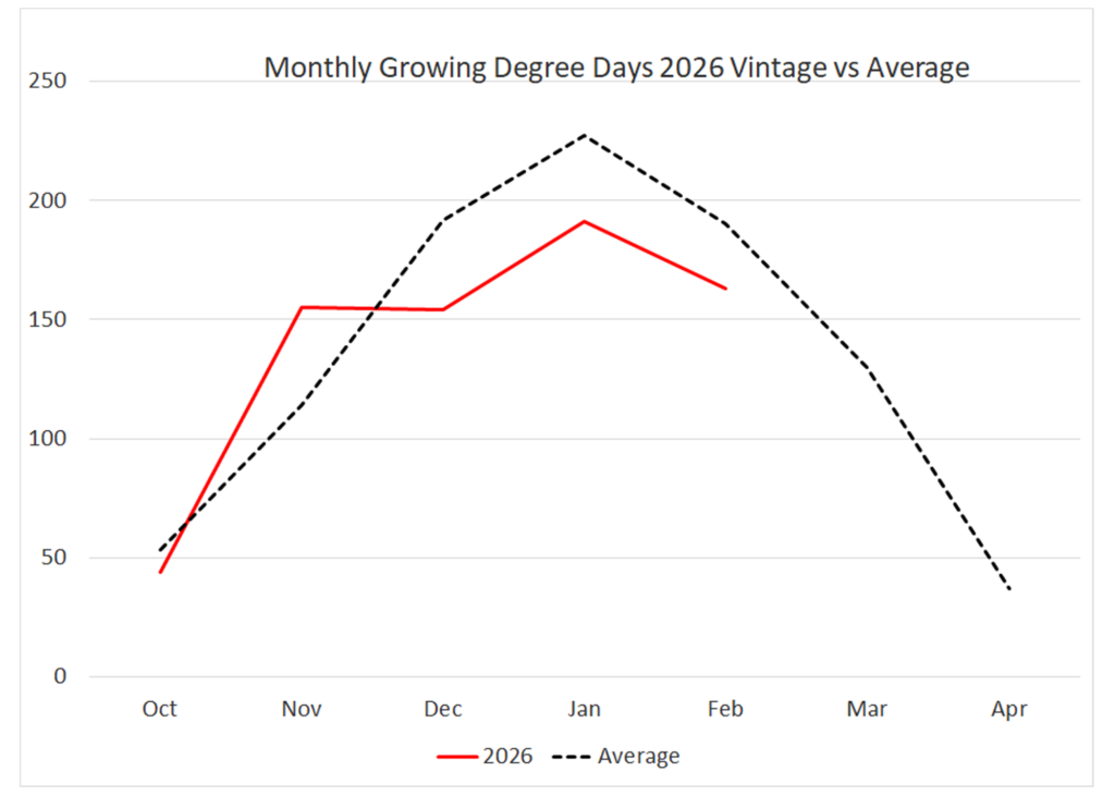 February also continued cooler than normal. This means an accumulation of ten weeks of cooler than normal temperatures and a growing season where events like berry colour change and ripening are 1-2 weeks behind . Late but not too late!